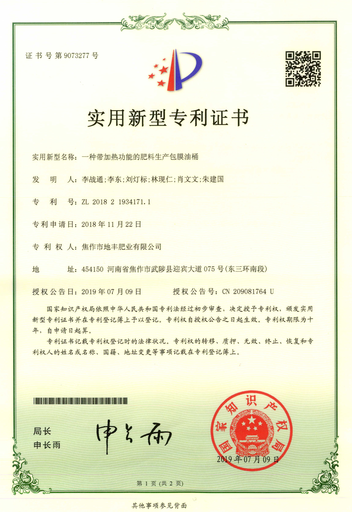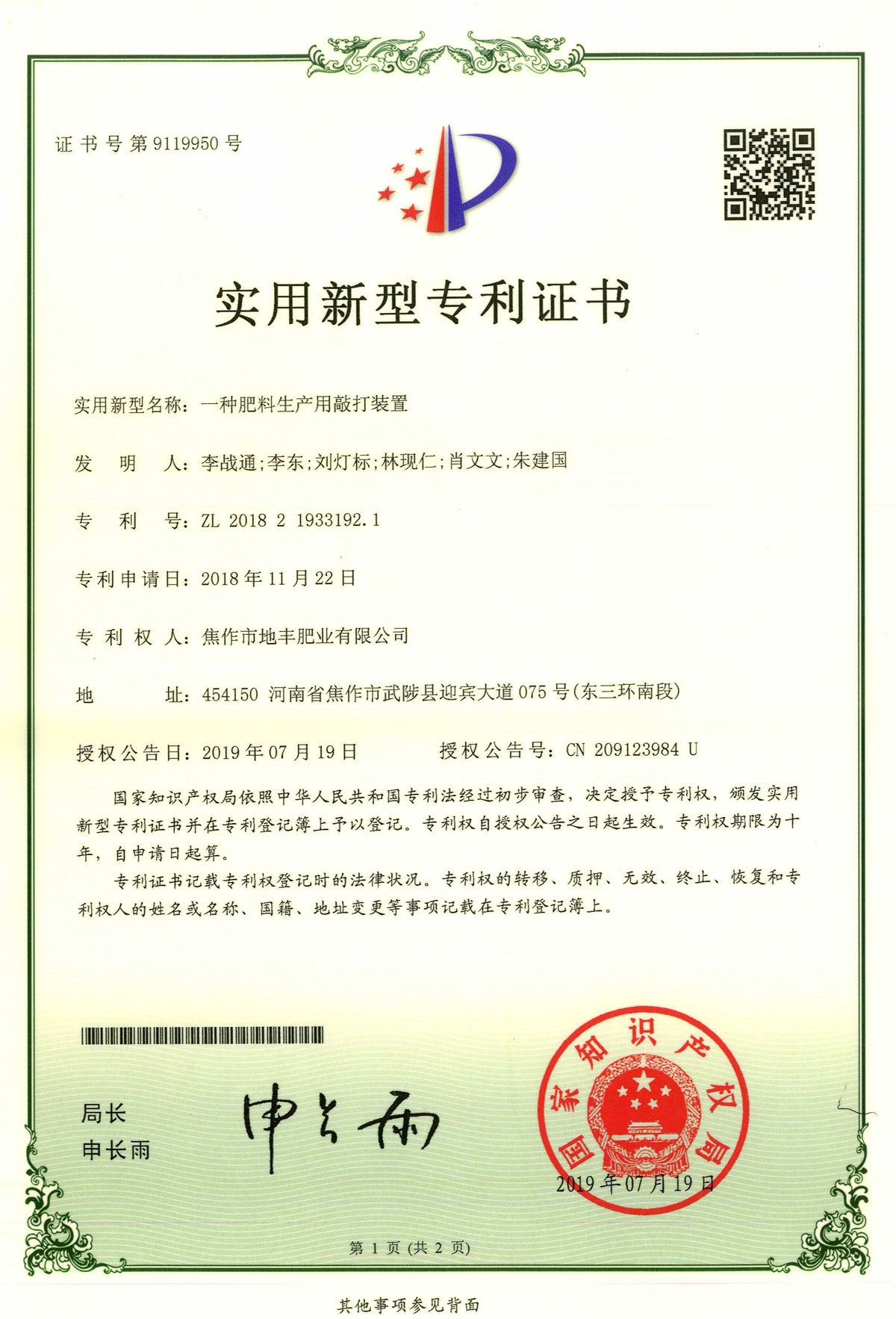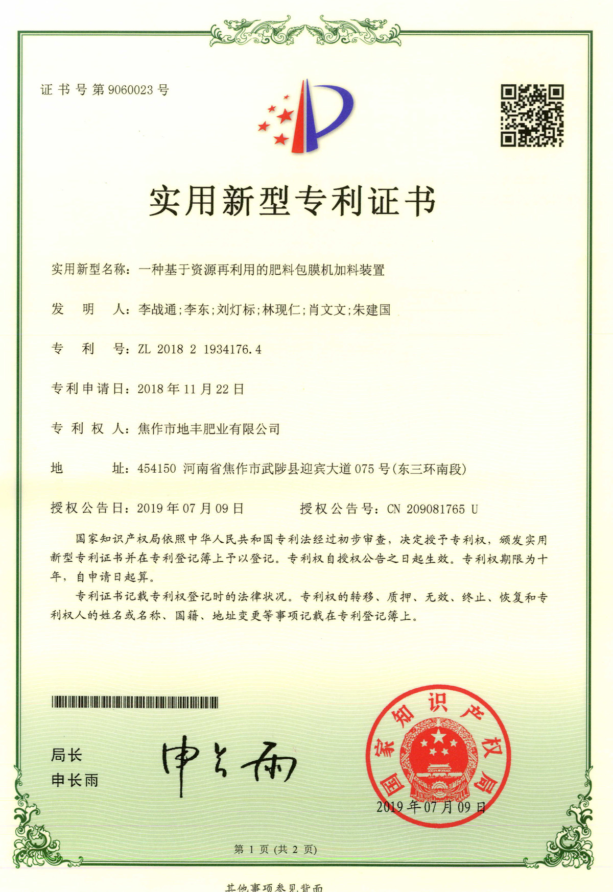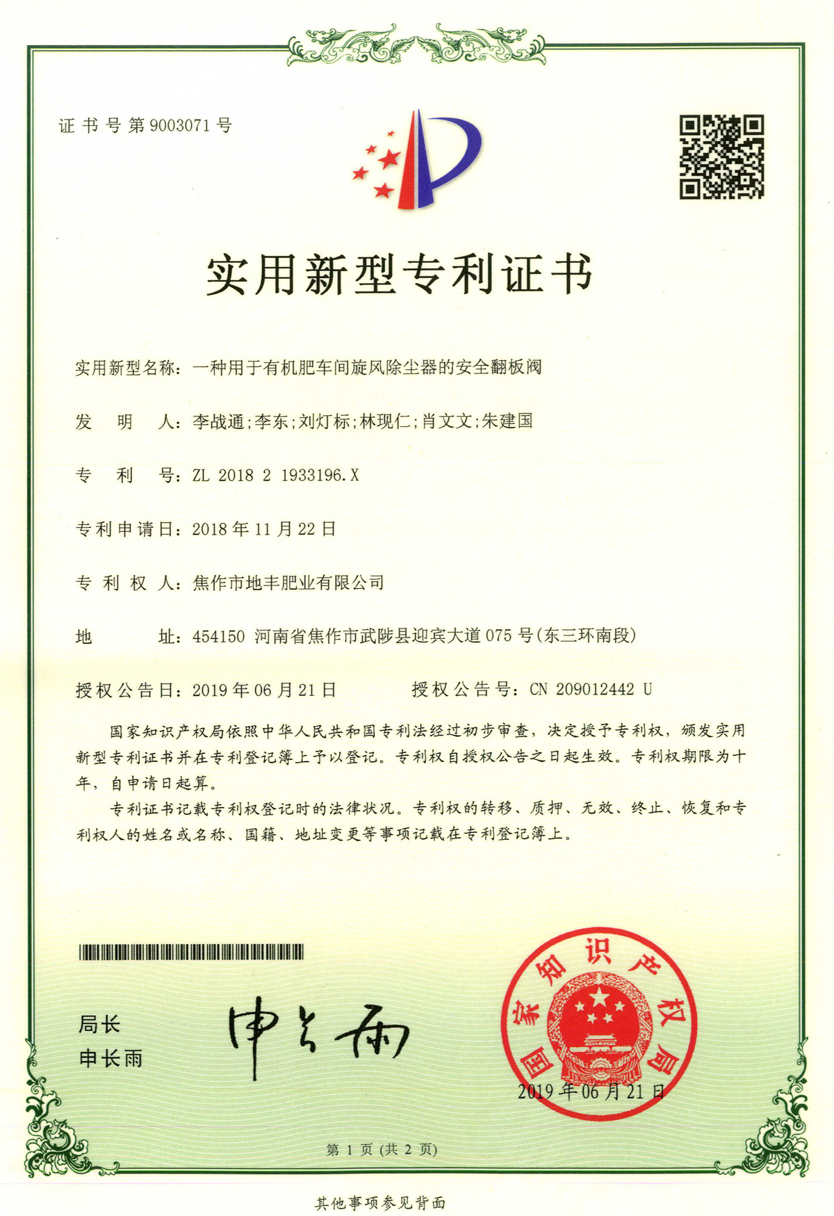 腐殖酸發明專利證書