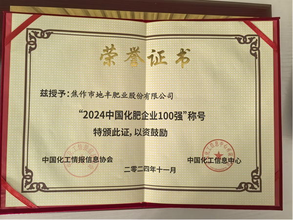 2024年11月29日,一條喜訊從鄭州傳來,在中國化肥企業100強評選活動暨中國化肥產業新質生產力論壇上,焦作市地豐肥業股份有限公司再次榮獲“中國化肥企業